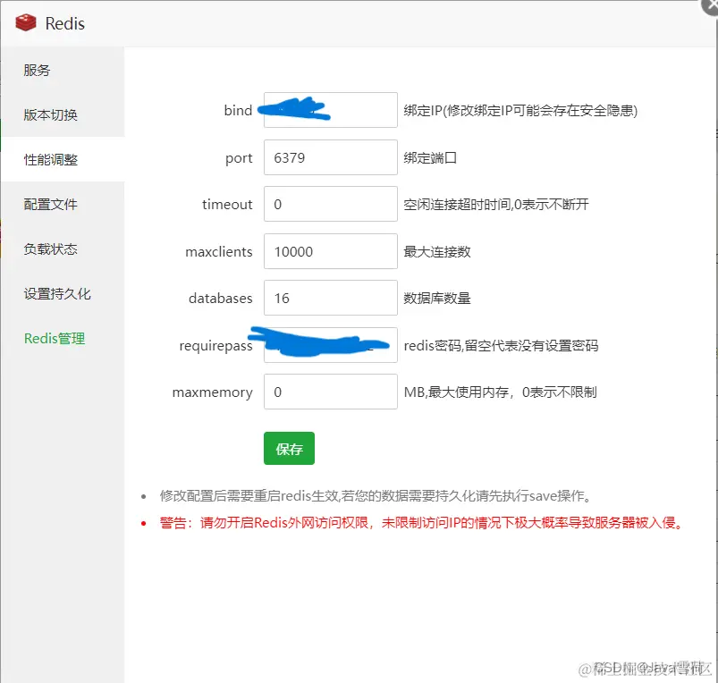 点击设置,再点击性能调整,这里可以设置Redis数据库数量,密码和端口啥的。(建议设个密码,要和yml文件Redis的密码一致。)