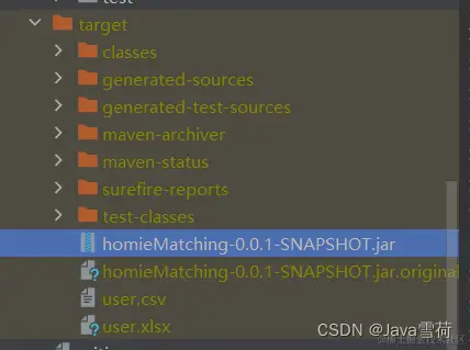 打包完成之后,target目录下就会出现一个homieMatching-0.0.1-SNAPSHOT.jar文件,这个就是后端打包后的jar包。