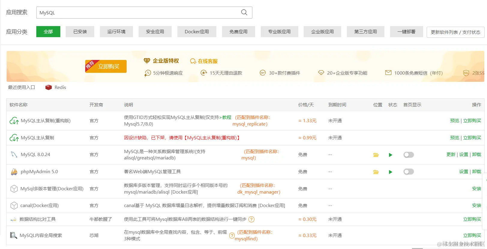 还是一样在软件商店搜索MySQL,点击安装。选择你需要的版本,我选的是8.x,再点击极速安装。