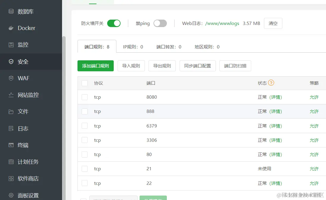 宝塔亦是如此点击侧边栏的安全,再点击添加端口规则就可以放行了。