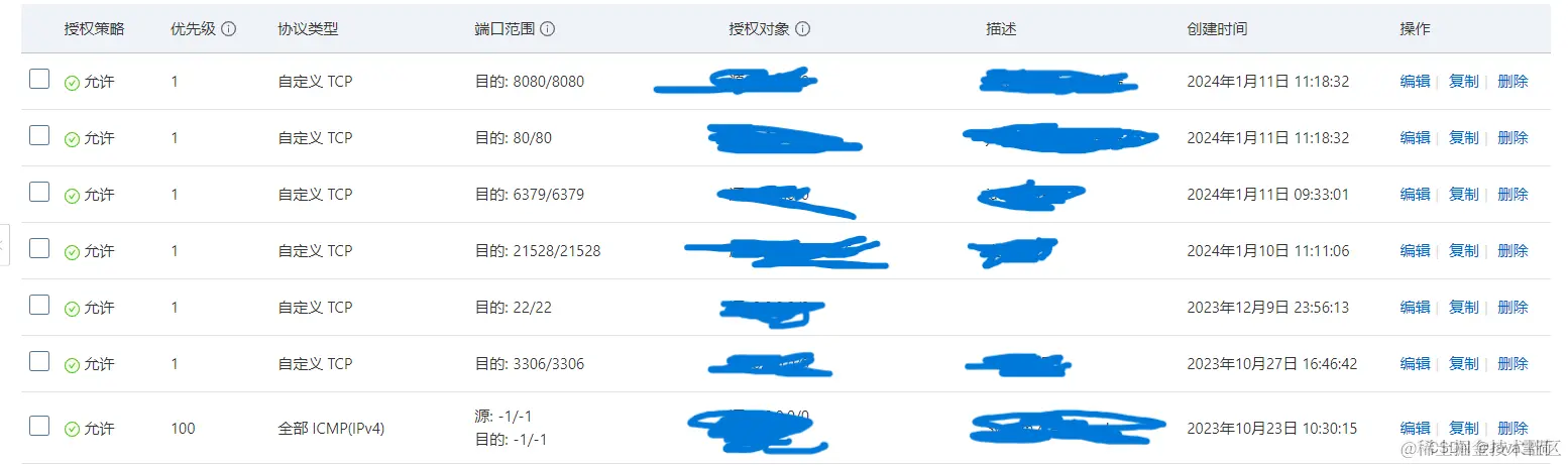 最后,在服务器中添加安全组,放行对应的端口。(6379:Redis端口,3306:MySQL,80:前端,8080:后端,21528:宝塔面板端口)