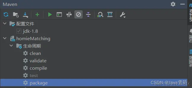 点击Maven,点击禁止标志(这是为了跳过Test测试用例的打包,如果某些Test类有问题就会打包失败),再点击package准备打包,等待打包完成。