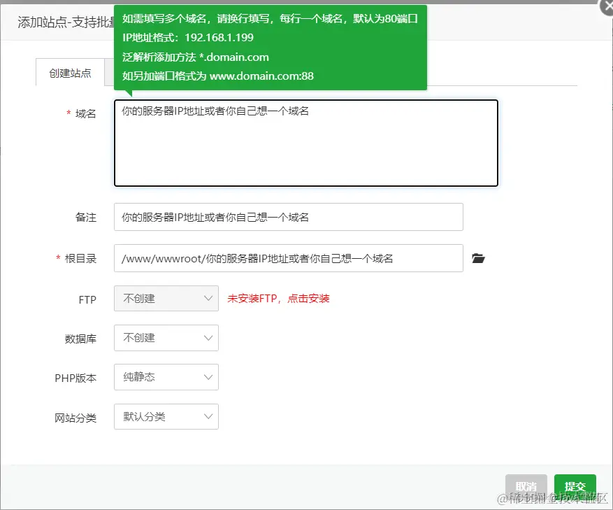 连接Linux宝塔面板后点击PHP项目,点击添加站点。域名最好就填你的服务器IP地址,或者你自己想一个域名(前提域名是你买的,不是随便起的)吧。随后直接提交。