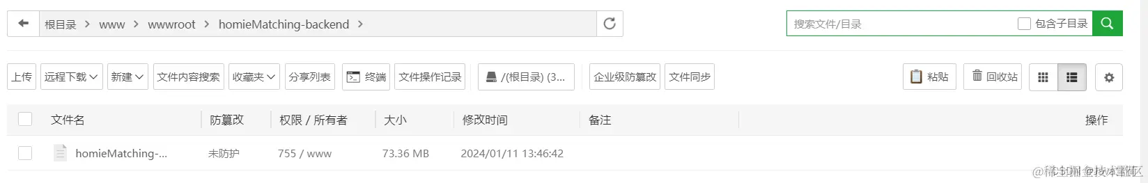 点击侧边栏中的文件在/www/wwwroot目录下新建一个文件,将打包后的jar放进新建的目录下。我新建的目录名是homieMatching-backend。