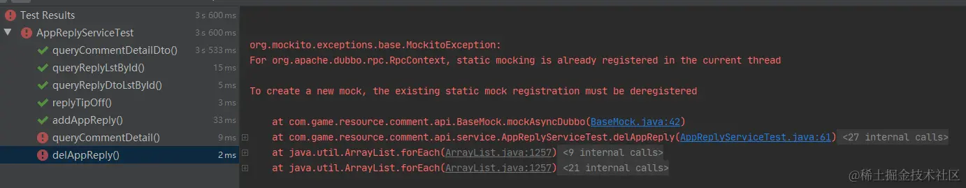 解决方案:每个测试用例调用完成MockedStatic rpcContextMockedStatic = Mockito.mockStatic(RpcContext.class);之后必须手动关闭: