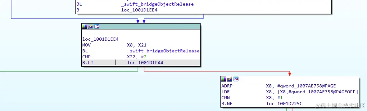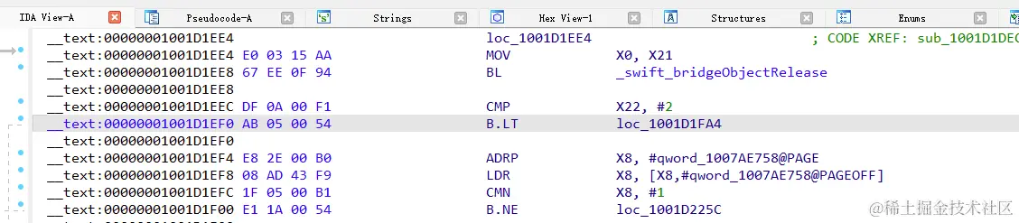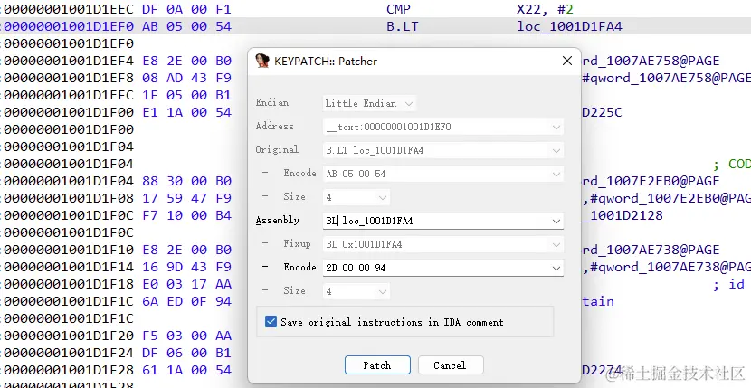 找到汇编代码处,将 B.LT 直接改为默认直接跳转,即 BL 【ARM的汇编指令可以直接谷歌或者ARM官网查看,这里不过多解释】