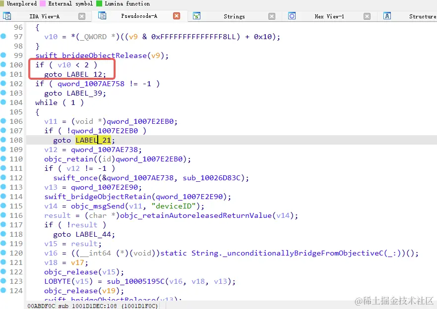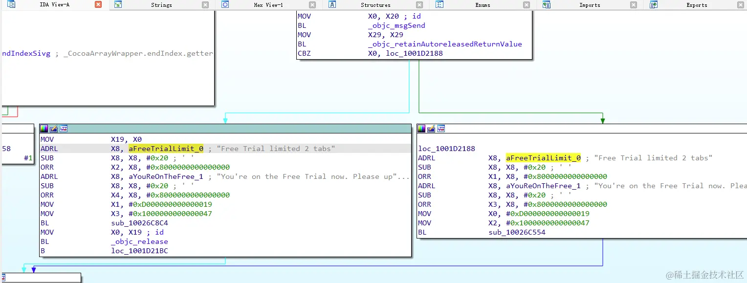 使用IDA Pro定位找到 LABEL_21 【显示限制2 Tabs文案出现的逻辑】上下文逻辑,发现重大怀疑对象,此处写死了判断是否小于2,故直接破案,待我们修改来验证即可。
