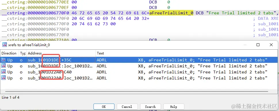 查看交叉引用,目前以 2 Tabs ****限制为例,发现有两处函数引用该文本显示;我们一处一处来处理。