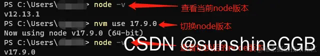 ④ nvm use xxx:切换版本,xxx指具体版本号 如nvm use 12.13.1