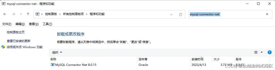 执行sql查询时出现如题错误,原因是安装mysql-connector-net的版本过高,当前项目在用的mysql版本不符合;关于当前安装的mysql-connector-net版本的查看可在控制面板-程序和功能里看到