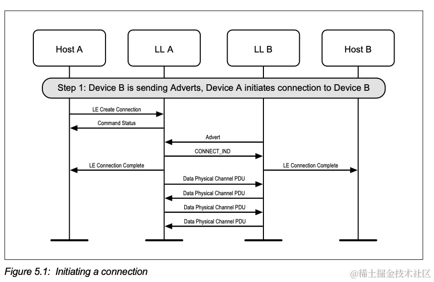 注意: 一旦进入连接状态,就视为建立了连接。建立连接后,主机会发出一个数据并等待从机的响应,如果在6个连接间隔内都未等到从机的数据包,则视为连接断开。