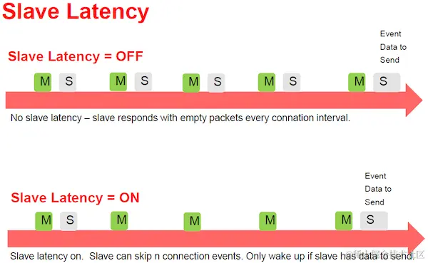 但如果slave定义了slave latency,比如slave latency = 9,此时slave可以每9个connection interval才回复一次master,也就是说slave可以在前面8个connection interval期间一直睡眠,直到第9个connection interval到来之后,才回复一个packet给master.