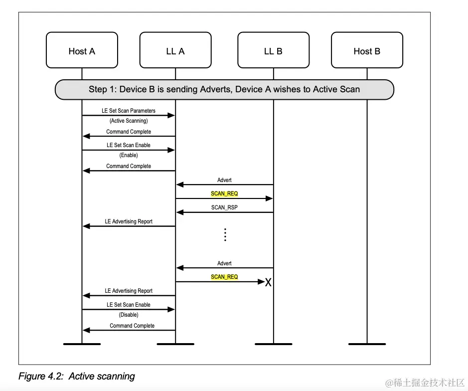 主动扫描和被动扫描使用的命令完全一样。但控制器要发送SCAN_REQ数据包给对端设备,以便获得扫描响应数据包,而这些数据包需要包含设备地址,所以,在使用LE Set Scan Parameter命令时需要配置一个额外参数,决定链路层的数据包使用固定地址抑或是随机地址。控制器收到了SCAN_RSP数据包将向主机发送一个LE Advertising Resport事件。