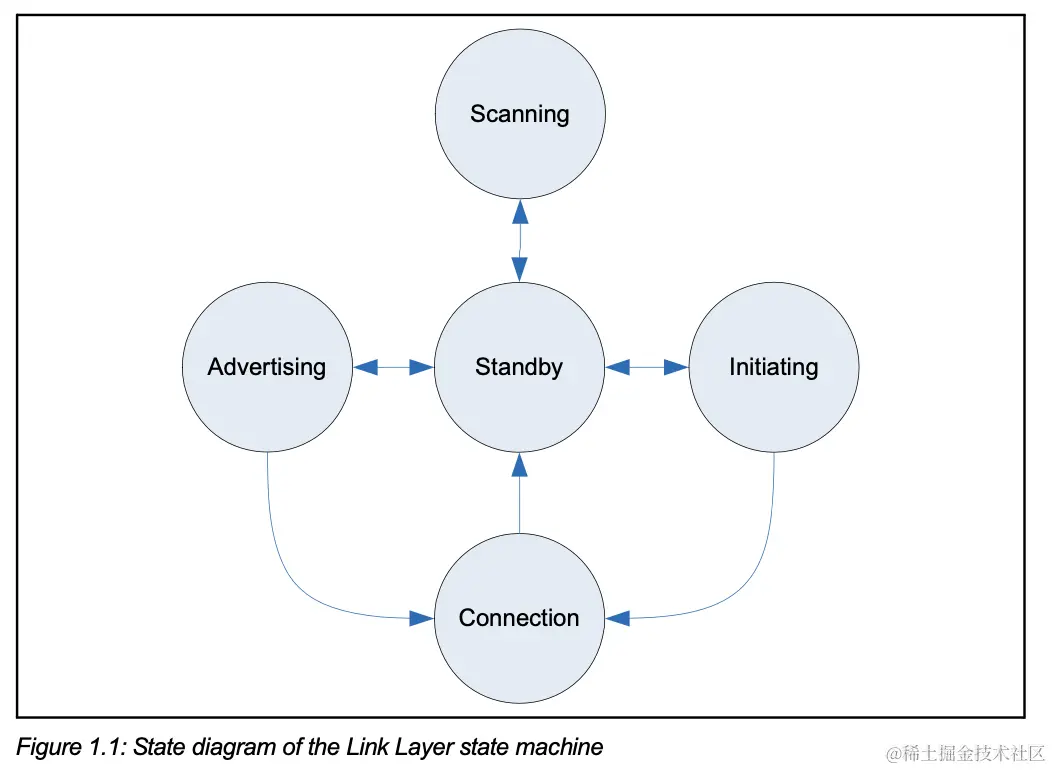 链路层的主要是状态机,包含广播、扫描、发起和连接等几种状态,在这几种状态中,BLE设备可以执行广播和连接等操作。定义了在各种状态下的数据包格式、时序规范和接口协议。