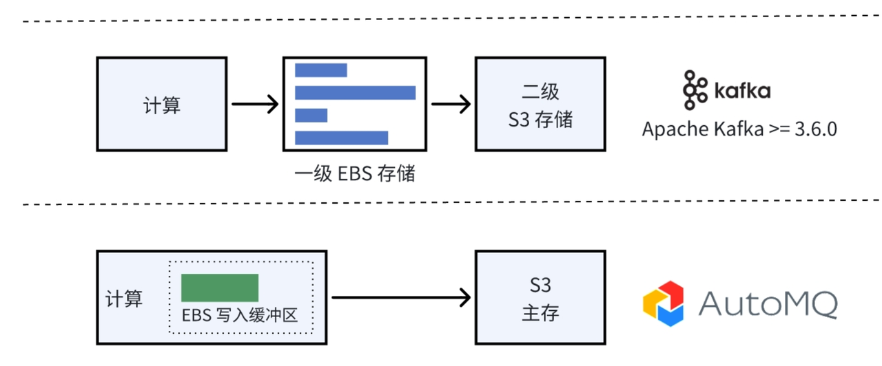 AutoMQ Kafka 虽然在架构上除了依赖对象存储以外还依赖 EBS 块存储,但是其本质上是采用了一个无状态的架构,一级存储是松耦合的,充当一个缓冲区的角色。下图可以揭示 Apache Kafka 的多级存储和 AutoMQ 存储架构的区别。AutoMQ Kafka 使用的 EBS 写入缓冲区默认值为固定的 3GB,在扩缩容场景可以完成秒级甚至毫秒级下线(取决于具体采用的机型)。