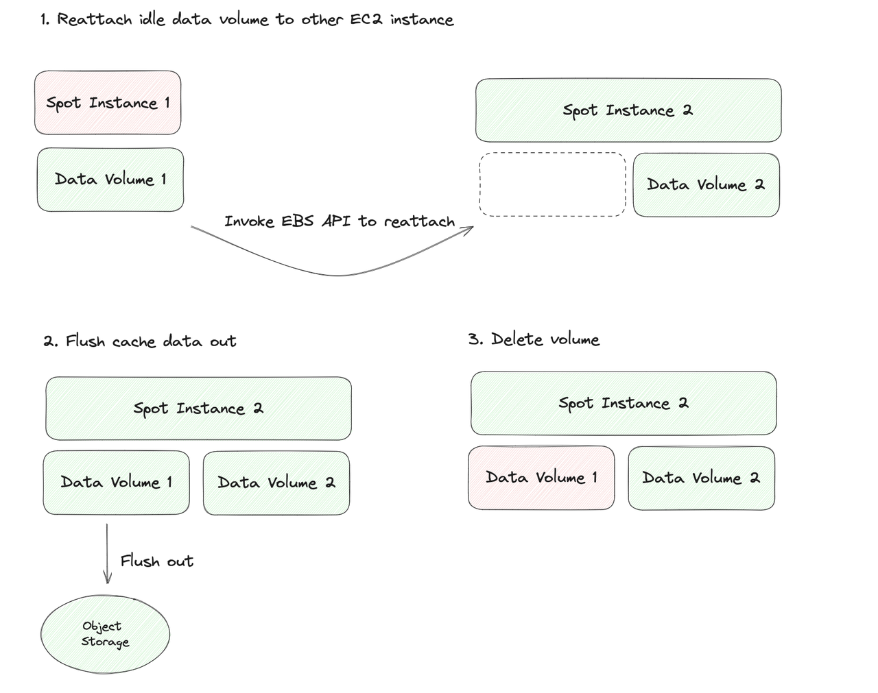 AutoMQ 通过探测及时发现由于 Spot 实例回收而遗留的游离数据卷,通过云盘管理的 API 将其挂载到一台合适的新的计算实例上