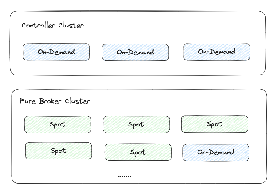 AutoMQ Kafka 虽然大量应用了 Spot 实例来降低成本,但是仍然在两个纬度上保留了少量按需实例的使用,从而确保 AutoMQ 可以给用户提供可靠的 Kafka 服务。