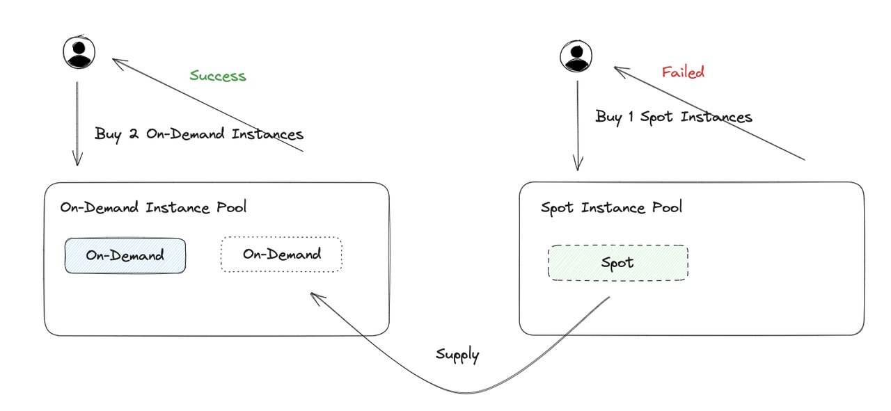 回退按需实例Spot 实例除了存在会中断的问题,还存在容易库存不足的问题。对于云厂商而言,按需实例是有 SLA 的并且要最高优先级保障库存余量充足。如果一个地域某个可用区下的计算实例库存不足,则会优先用于满足按需实例的供给。在这种规则下,一些冷门地域或者可用区的 Spot 实例库存容量容易产生不足,当需要发生实例替换时,会存在无法购买到竞价实例的情况。