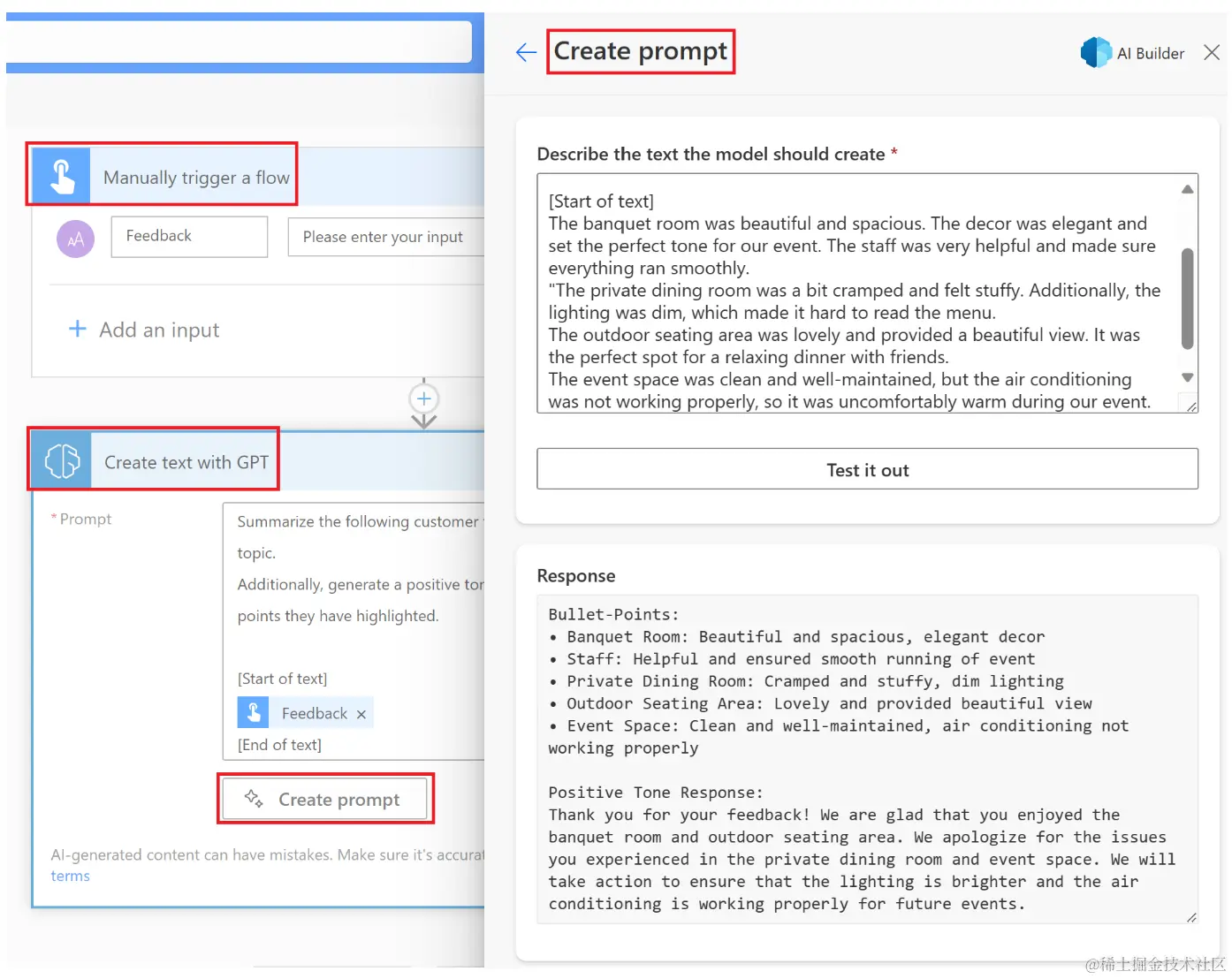 AI Builder 中的使用 GPT AI 模型创建文本让您能够根据提示生成文本,并由 Microsoft Azure OpenAI Service 提供支持。借助这个功能,您可以把 GPT 技术集成到您的应用和流程中,来构建各种自动化流程和富有洞察力的应用。