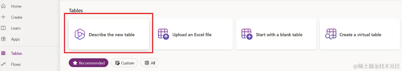 要使用 Copilot 在 Dataverse 中创建表,请按照以下步骤操作: