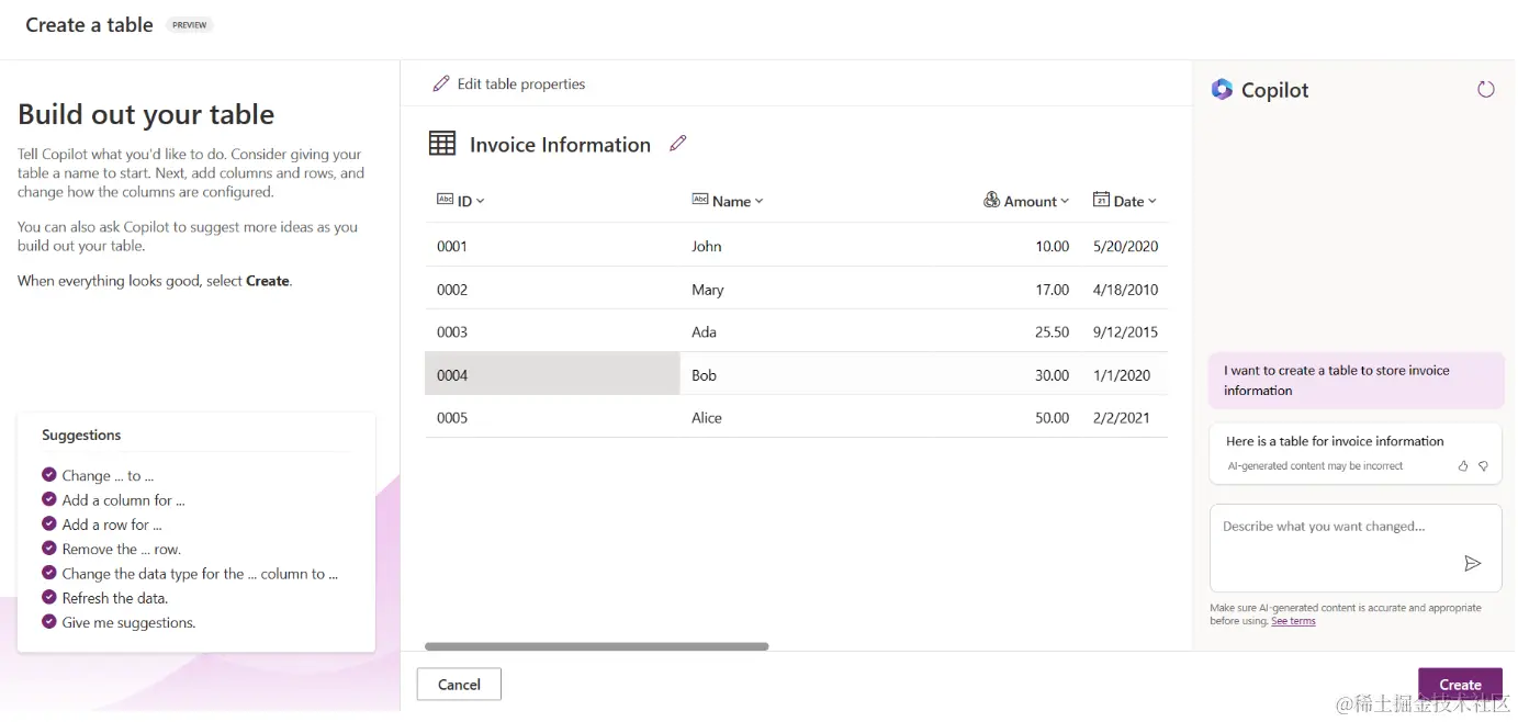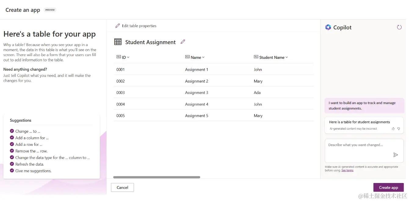 - AI Copilot 将建议一个 Dataverse 表,里面包含了存储要跟踪的数据所需的字段和一些示例数据。然后,您可以通过对话步骤使用 AI Copilot 助手功能来自定义表格来满足您的需求。
