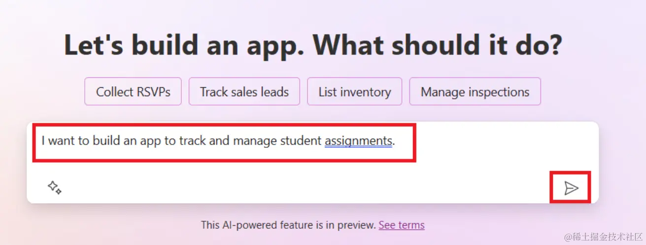 - 在主屏幕上的文本区域中描述您想要构建的应用。比如,我想构建一个应用来跟踪和管理学生作业。点击 发送 按钮把提示发送给 AI Copilot。