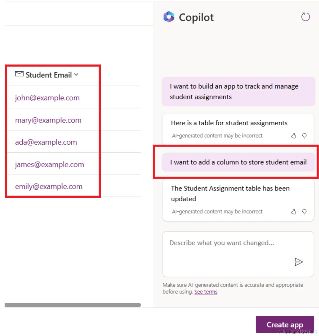 - 教育者希望给提交了作业的学生发送邮件,让他们知道作业的最新进展。您可以使用 Copilot 向表中添加新字段来存储学生的邮件。比如,您可以用以下提示来向表中添加新字段:我想添加一列来存储学生的邮件。点击 发送 按钮把提示发送给 AI Copilot。