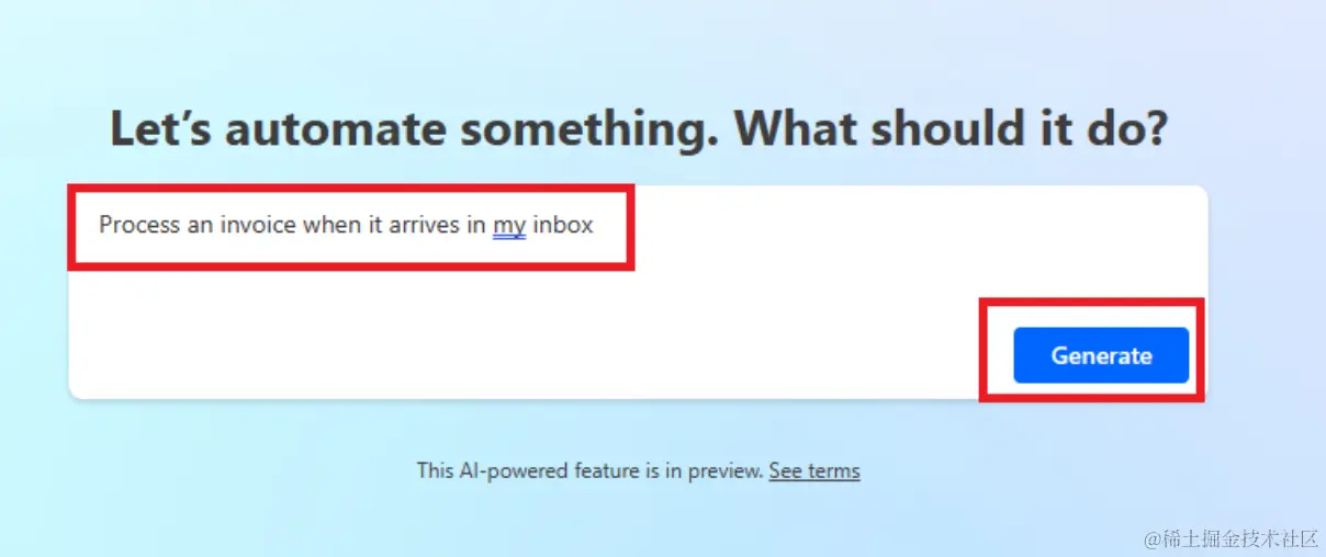 - 在主屏幕上的文本区域中描述您想要创建的流程。比如,当我收到发票的邮件时,就处理发票。点击 发送 按钮把提示发送给 AI Copilot。