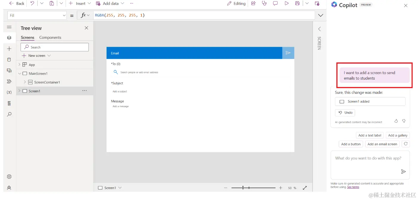 - 对于要给学生发送邮件的教育者,您可以使用 Copilot 向应用添加新屏幕。比如,您可以用以下提示来向应用添加新屏幕:我想添加一个屏幕来给学生发送邮件。点击 发送 按钮把提示发送给 AI Copilot。