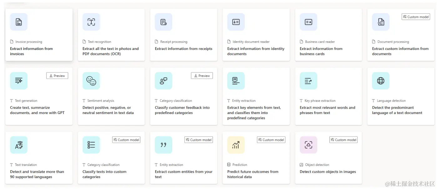 Power Platform 中提供的一些预构建 AI 模型包括: