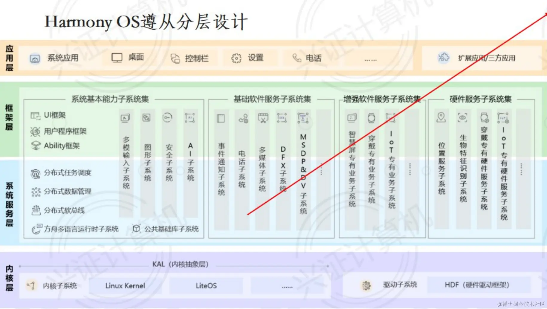 **内核层:**内核层包含内核子系统和驱动子系统。鸿蒙OS具有多个内核,针对不同的设备可以选择不同的内核,通过内核抽象层可以将底层的不同内核之间的差异屏蔽,并对上层提供统一的接口。驱动子系统负责提供统一的外设访问接口,以及负责驱动开发和管理框架。