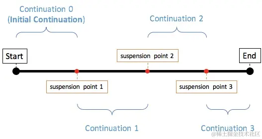 这里的原理并不复杂,我们捋一捋就能弄懂了:状态机函数,就是一个大的when语句。初始状态是没有续体的,创建一个续体对象,并执行第一部分代码,直到挂起点,修改续体到状态2,然后执行suspending函数,此时便挂起了,也就是说其实函数已执行完了。当挂起结束后,继续运行时,就回调续体里面的resume,仔细看resume又会回到状态机,只不过这时状态已在挂起前改为2了,所以会执行第2部分的代码。同理修改状态为3,然后再次挂起,等继续时就会执行到第3部分代码,这时没有挂起点了,所以不再传入续体,整体协程结束了。