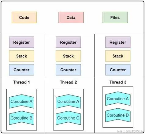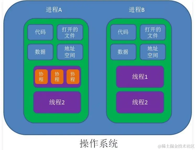 自上而下的来看,操作系统包含多个进程,每个进程有多个线程,而每个线程有多个协程。进程与进程之间共享操作系统提供的资源,如文件系统;进程分为程序的运行和资源,程序的运行就是线程(栈),资源就是堆内存;线程是代码的运行,其有独立的栈来存储自己的数据,包括执行中的代码和产生的本地数据,都在栈帧上面,此栈是操作系统中的代码栈,代表着CPU的运行,因此线程仍需操作系统支持,进程中的不同线程共享进程的堆内存,可以共享堆数据,当然也带来了麻烦;协程用来操作线程中代码运行的框架,是粒度更为小的代码的运行,但它并没有真实的栈,因此协程只是运行中的代码,并没有自己的数据,当然也可以共享堆内存。