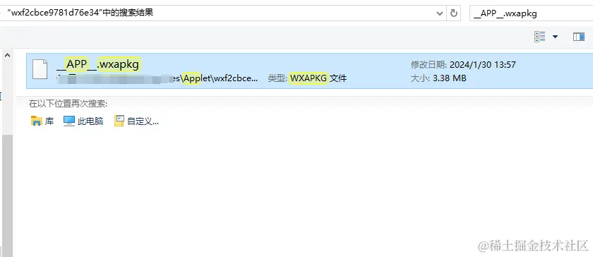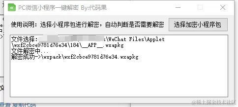选择加密的小程序包 ,比如:xxxxx\Applet\wxf2cbce9781d76e34 ,搜索到 ‘__APP__.wxapkg’ 文件