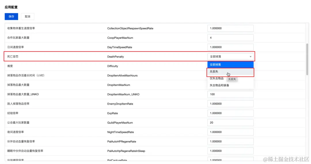 1)单击面板内的 调整参数 按钮,即可在下方表格中开启编辑模式。找到 “死亡惩罚” 配置项,并将它的值修改为 无丢失 。