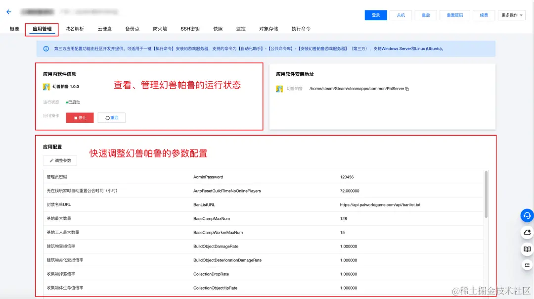 2)在实例详情页点击 “应用管理”,即可看到幻兽帕鲁的配置面板。