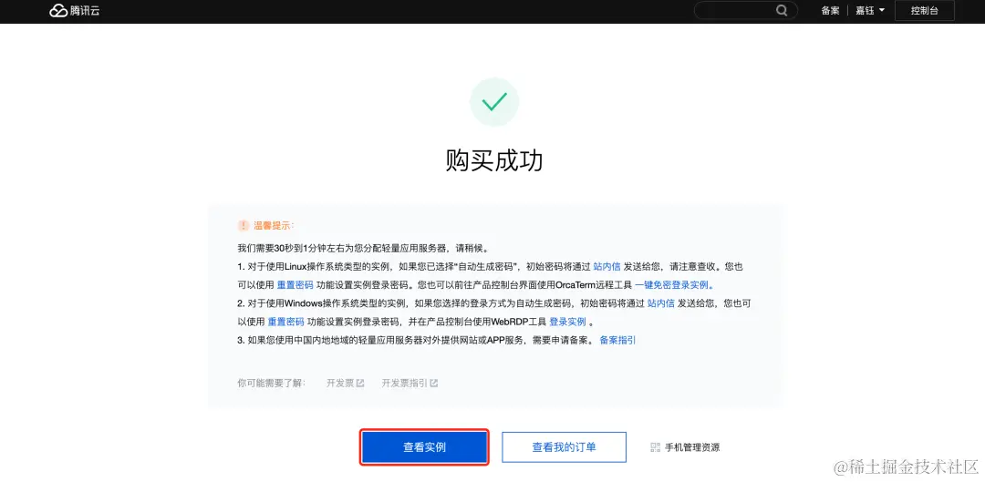 2、确认订单并成功支付后,可以在购买成功页单击【查看实例】查看您购买的幻兽帕鲁服务器。