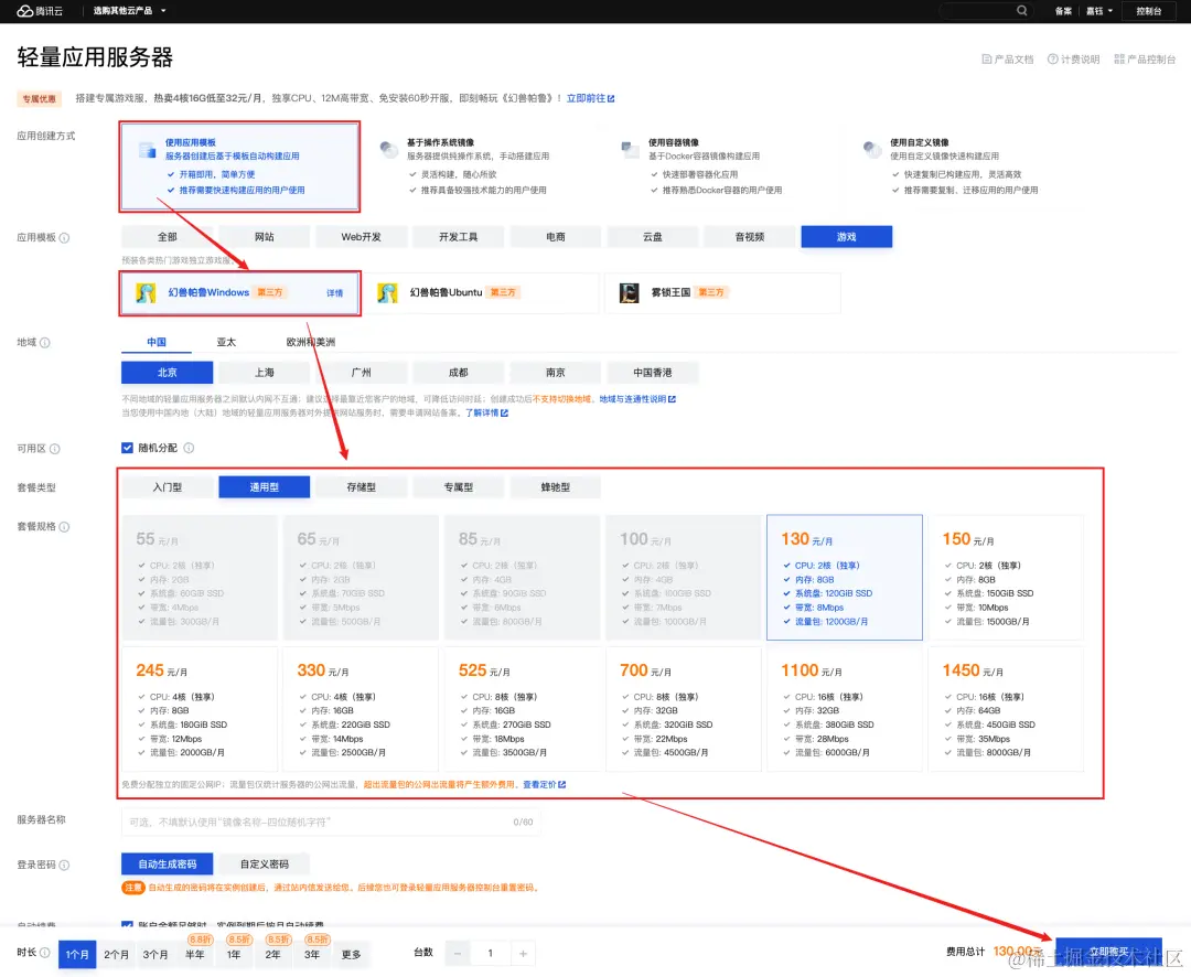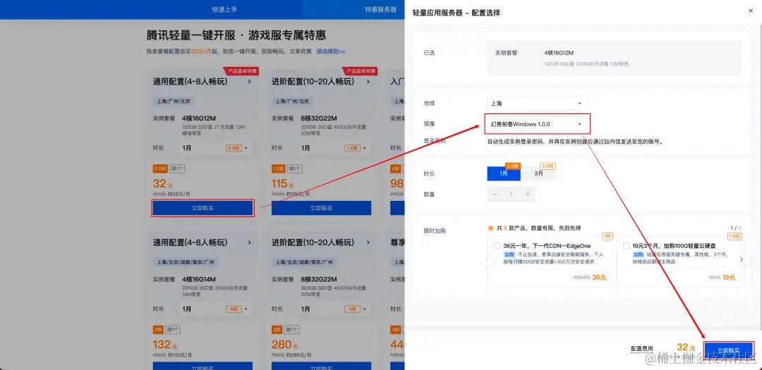 1、通过 游戏服务器专属优惠页 或 腾讯云轻量应用服务器 Lighthouse 购买页,选择 “幻兽帕鲁Windows”,并点击立即购买。