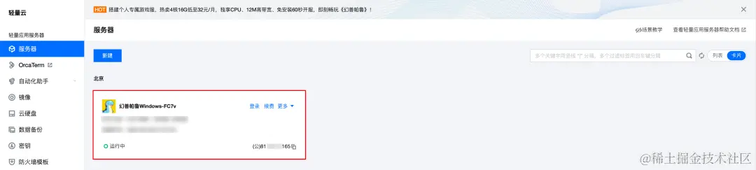 1)登录腾讯云轻量应用服务器控制台,找到部署了幻兽帕鲁的服务器(第三方应用模板:幻兽帕鲁),单击实例卡片进入详情页。