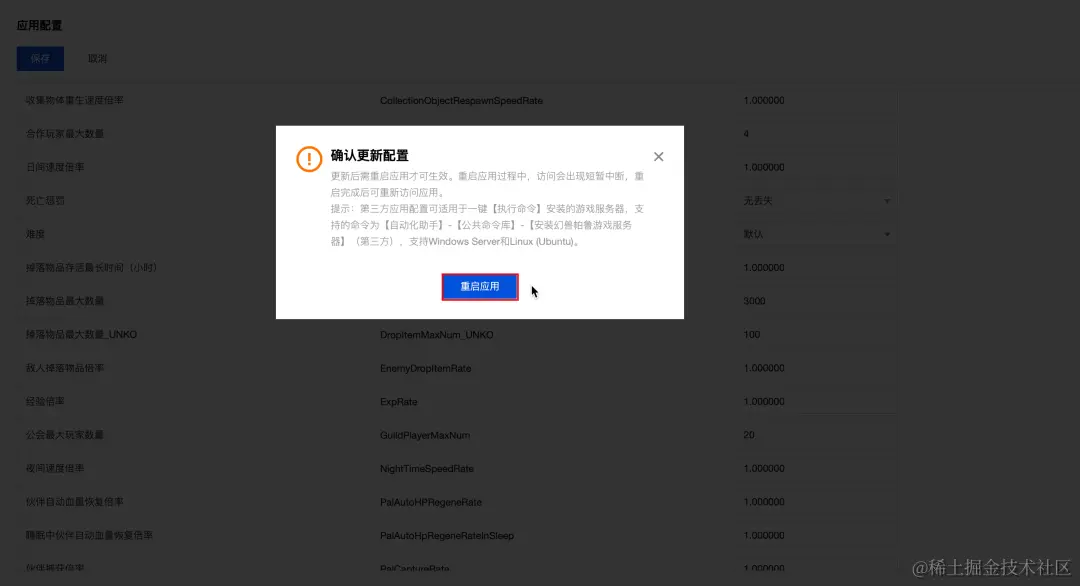 2)点击 保存 按钮,此时将弹出气泡,提示你当前操作需要在游戏服务重启后才可生效(不会重新启动服务器),你可以点击 重启应用 按钮,刚刚的修改即可生效。