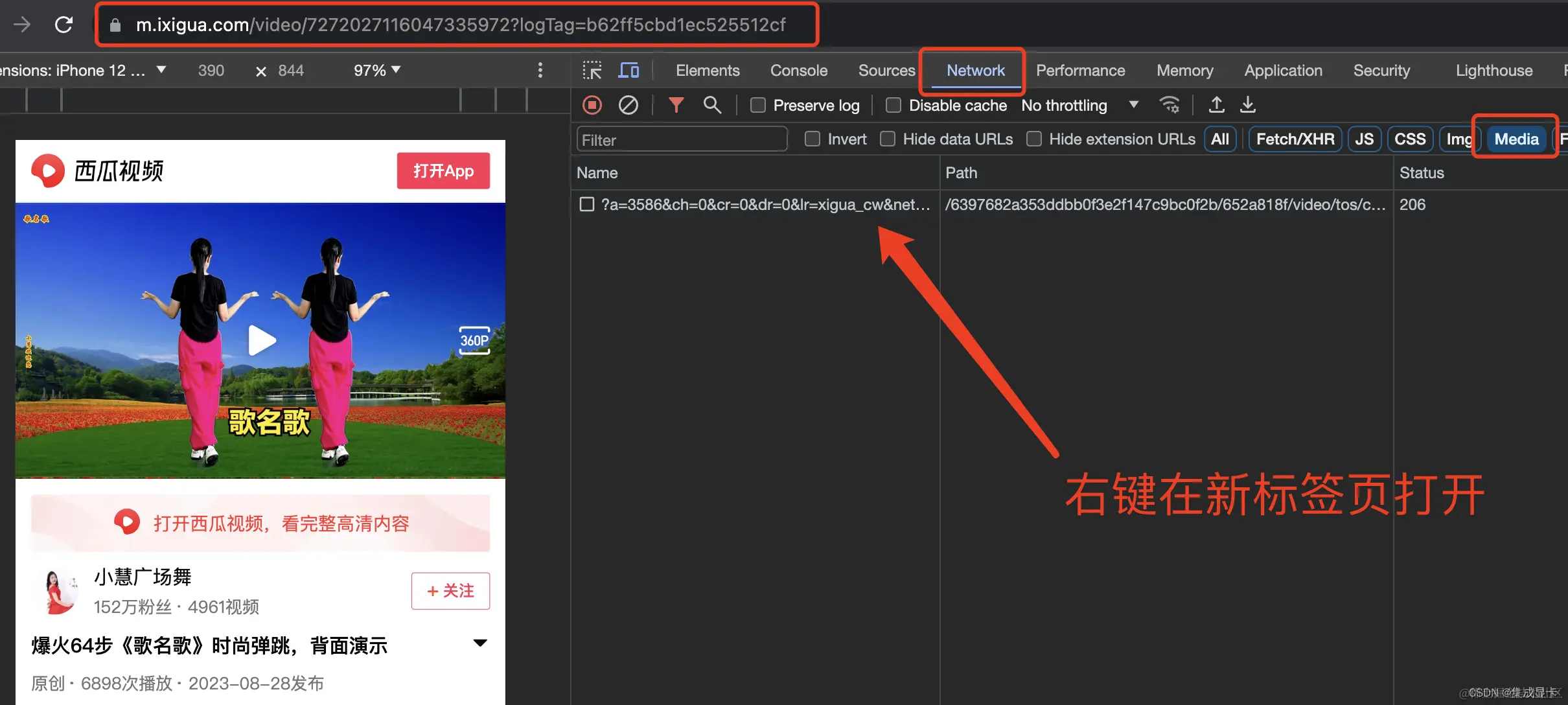 - 在 Network 面板下,筛选 Media ,找到原视频的链接,右键在新标签页打开