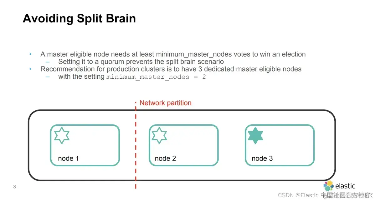 为了避免这些问题,建议集群中至少有三个符合主节点资格的节点。 原因是 Elasticsearch 使用基于仲裁的投票系统来选举主节点。 仲裁的计算方式为 (master_eligible_nodes / 2) + 1。因此,在三节点集群中,至少有两个节点需要同意选举新的主节点,以防止出现裂脑情况。