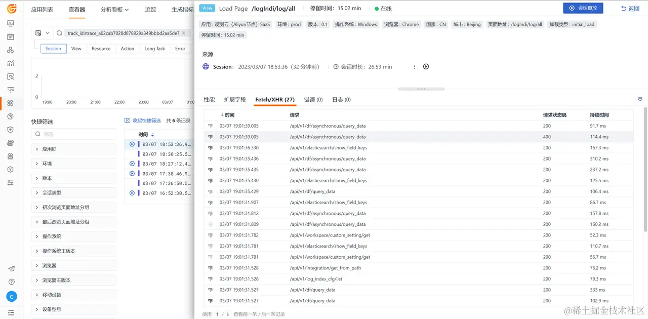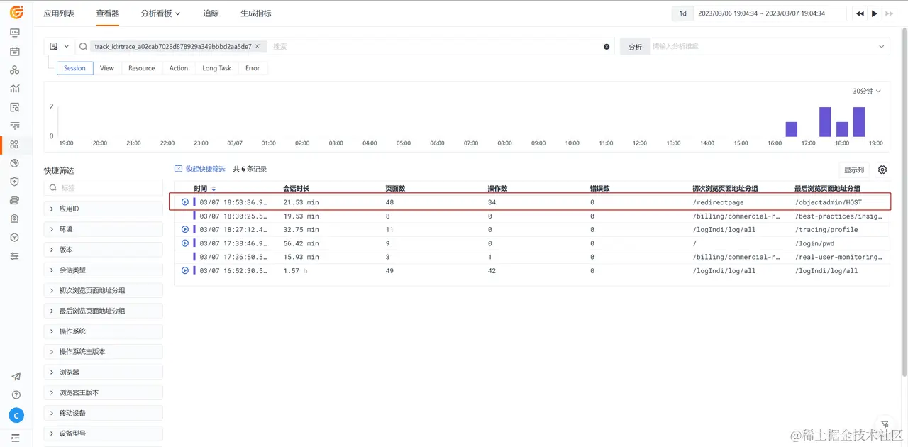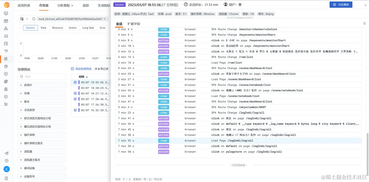 登录观测云,进入「用户访问监测」应用列表,选中「XXX」 Web 应用,进入查看器,根据上面生成的追踪 ID (track_id:实际 ID) 筛选查看用户实际访问轨迹数据。