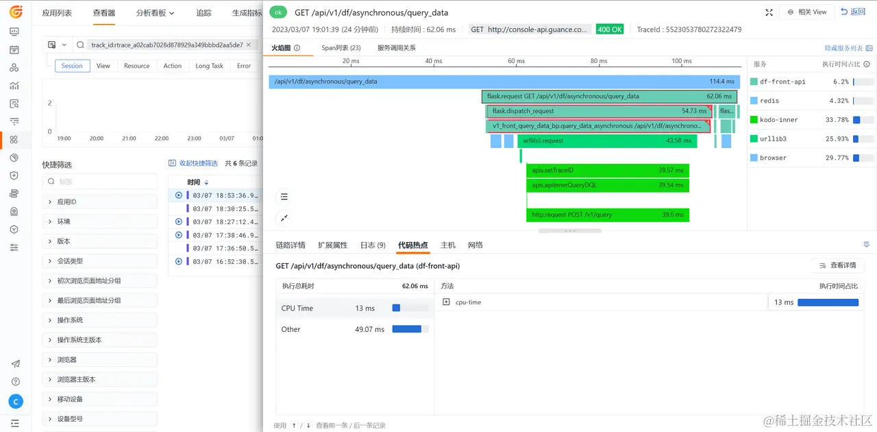 - (可选)若需分析代码性能瓶颈,则可以定位到 df-front-api 后端服务所在顶层 Span,查看「代码热点」,了解 Span 执行过程中的执行耗时占比及方法调用耗时分析
