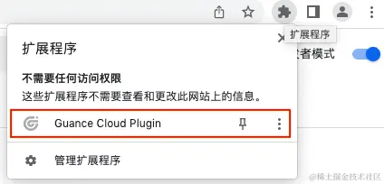 - 右上角点击图标「扩展程序」,找到「Guance Cloud Plugin」双击打开插件。