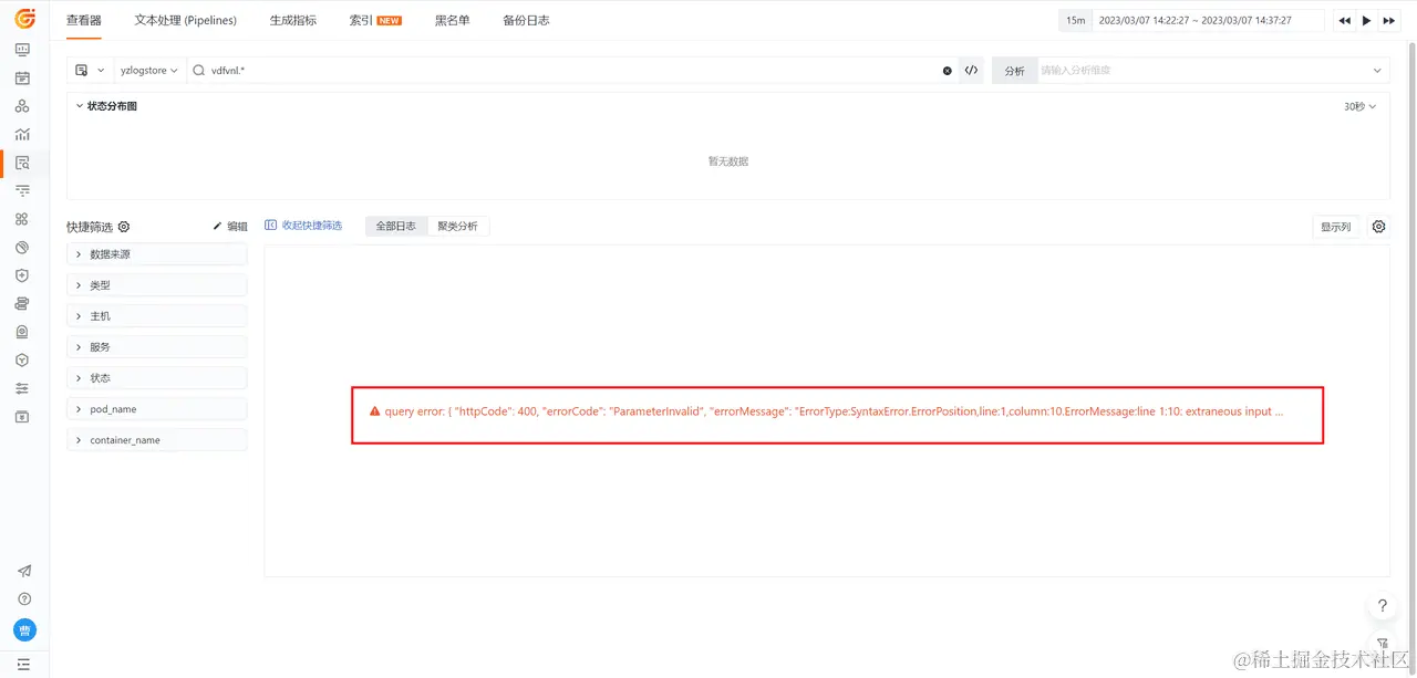用户在访问使用观测云日志查看器时,搜索关键词产生了以下报错。