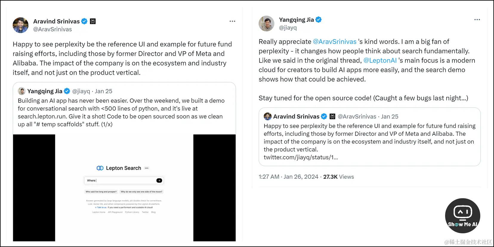 Perplexity CEO @AravSrinivas 发推,大概意思是「Meta 和 阿里巴巴的前高管都在参考我们的UI,说明我们出圈了」。贾扬清转发并回帖表示,这个小项目只是为了演示 Lepton AI 如何帮助开发者更容易地构建AI应用,无意碰瓷。随后就发布了开源信息。