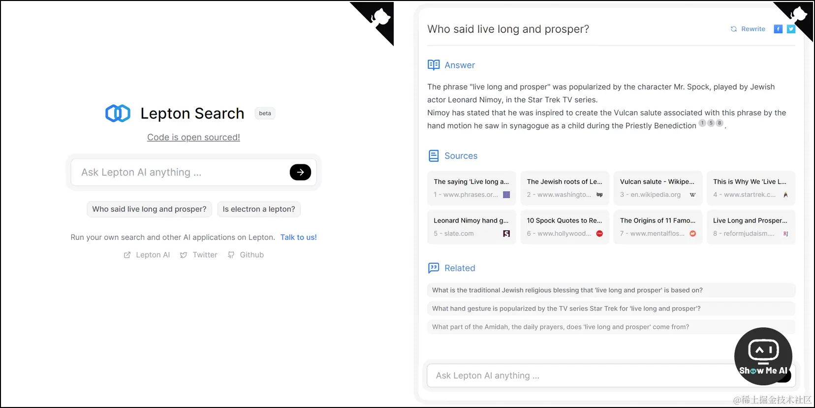 为了展示 Lepton AI 对于开发者的助力,他亲自上手撸了 500 行代码,实现了一款生成式搜索引擎,访问上方 👆 链接可以体验~