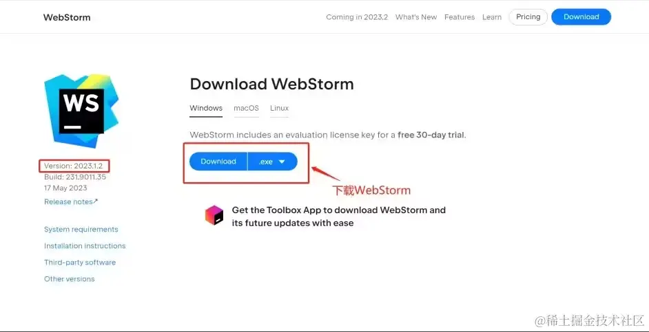 我们先从 Webstorm 官网下载 Webstorm 2023.1.2 版本的安装包,官网链接如下: