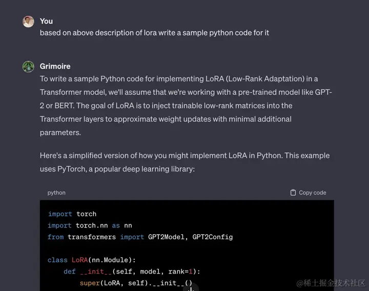 根据一位内测用户的论文复现介绍,首先使用@AiPDF_GPT论文解读工具对LoRA技术的论文进行分析,然后使用Grimoire编码工具根据描述信息编写代码,最终在PyTorch中实现了LoRA简化版的Python代码。